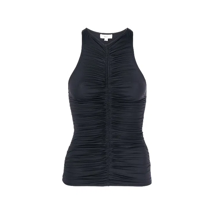 If you prefer something form-fitting and has unique details, try on this black halter top with ruched detailing that’ll look great in any ensemble. Elevate the look by adding a statement necklace.