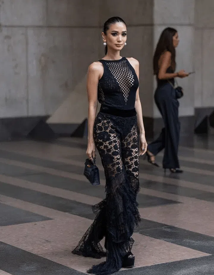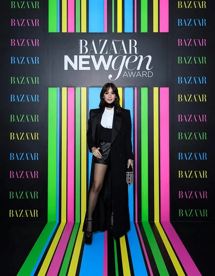 Heart sported an asymmetrical white blouse paired with simple black trousers and an Hermès Kelly Cut bag. She opted for a slick hairstyle, allowing her natural beauty to shine through.