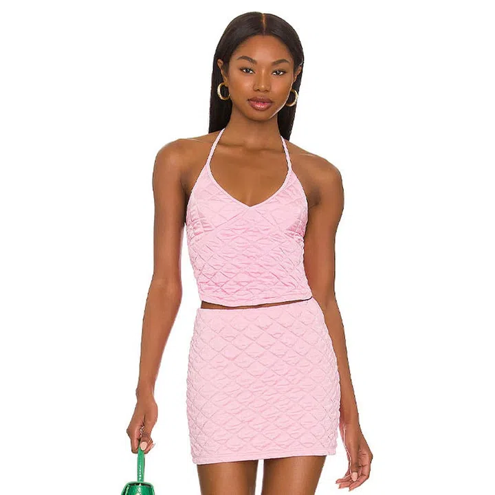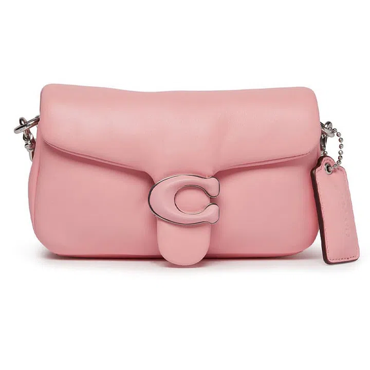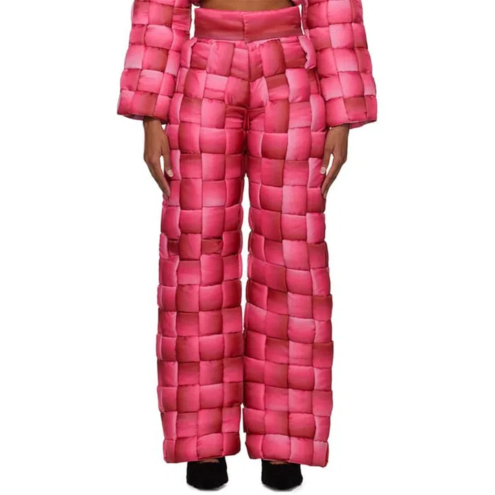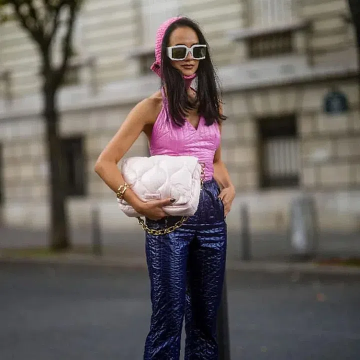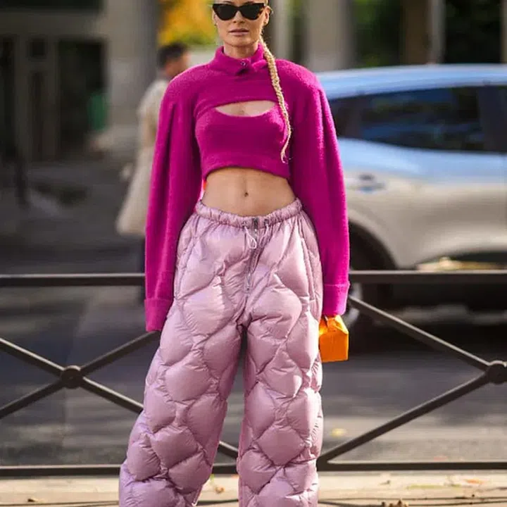 When in doubt, go monochromatic. For this look, keep the bottoms busy with a pair of high-waisted padded pants featuring a weave pattern and go simple with a long-sleeve crop top. Keep jewellery to a minimum or none at all and let the fit do all the talking. But never leave the house without a bag and in this case, the Coach Pillow Tabby in pink is a no-brainer.