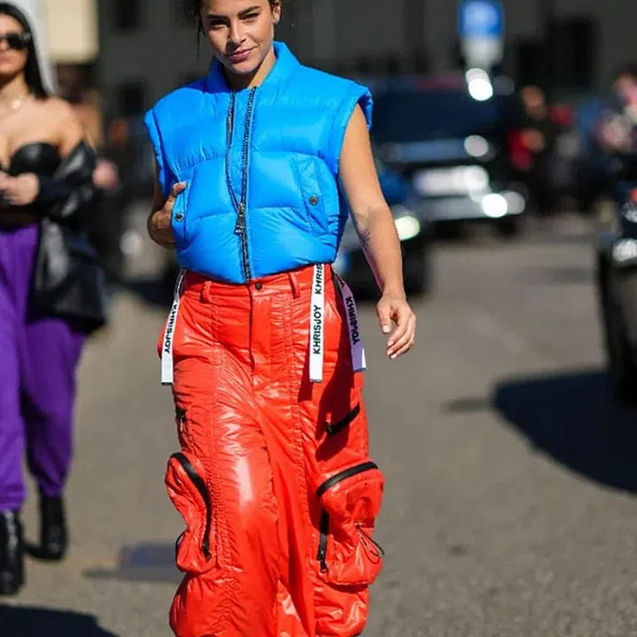 Merge cool and cute with an elevated streetwear look centred around leather parachute cargos that puff up at the ankles. Let’s do away with the gilet since our year-round tropical weather has no use for it, and opt for a cropped vest top instead. Last but certainly not least, slip on some Nike Jordans for that drip.