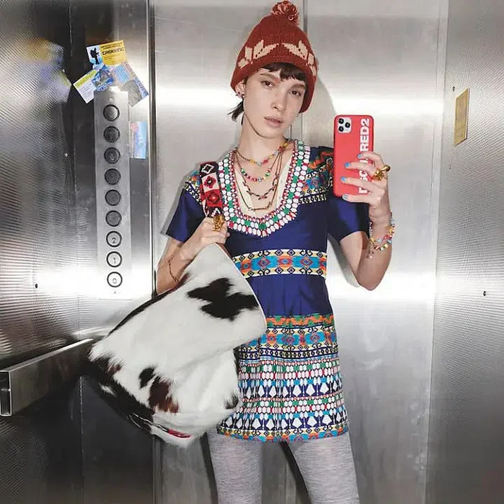Echoing the relaxed feel is Dsquared2 with an après-ski get-up of a printed mini worn over leggings, topped with a beanie, an oversize tote and hiking boots for good measure.