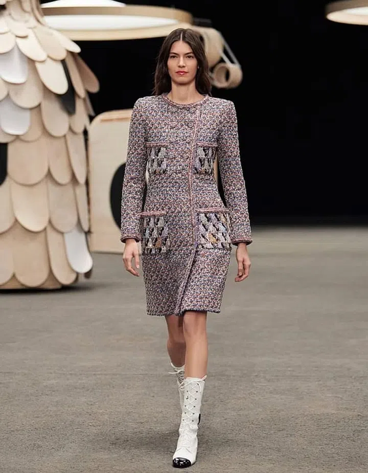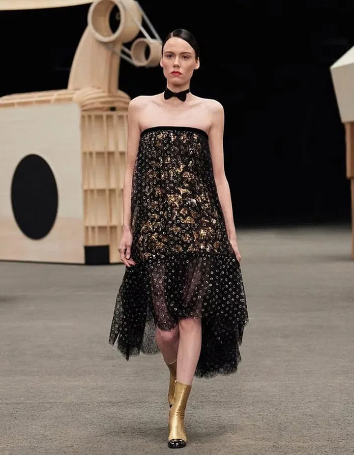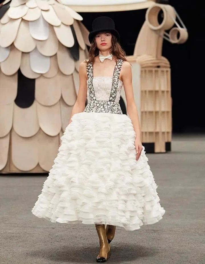 Flirty high hemlines, bowties, and boots are some of the touches that give the Chanel Spring/Summer 2023 Haute Couture collection a jolt of youthfulness. Credit: Chanel