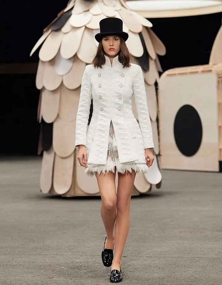 Composed of an A-line silk tulle skirt pleated by Lognon with double-breasted coatdress embroidered tassels by Lemarie, this opening look is inspired by majorette costumes. About 9,000 pieces of beads and strass were used for the embroidery. Additionally, Lemarie hand-embossed dahlia petals in white organza on the skirt.
