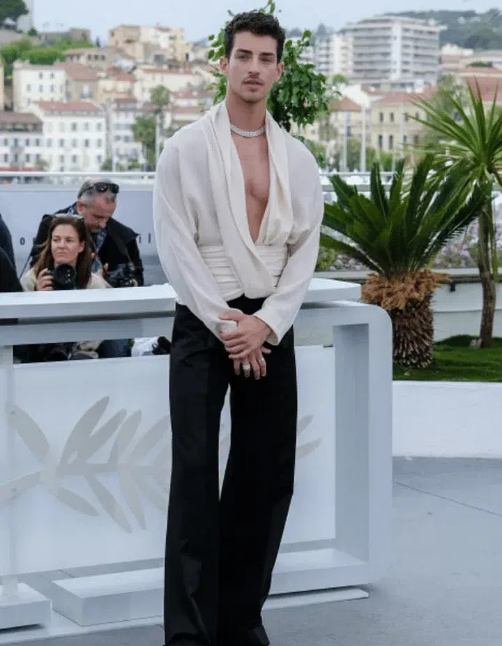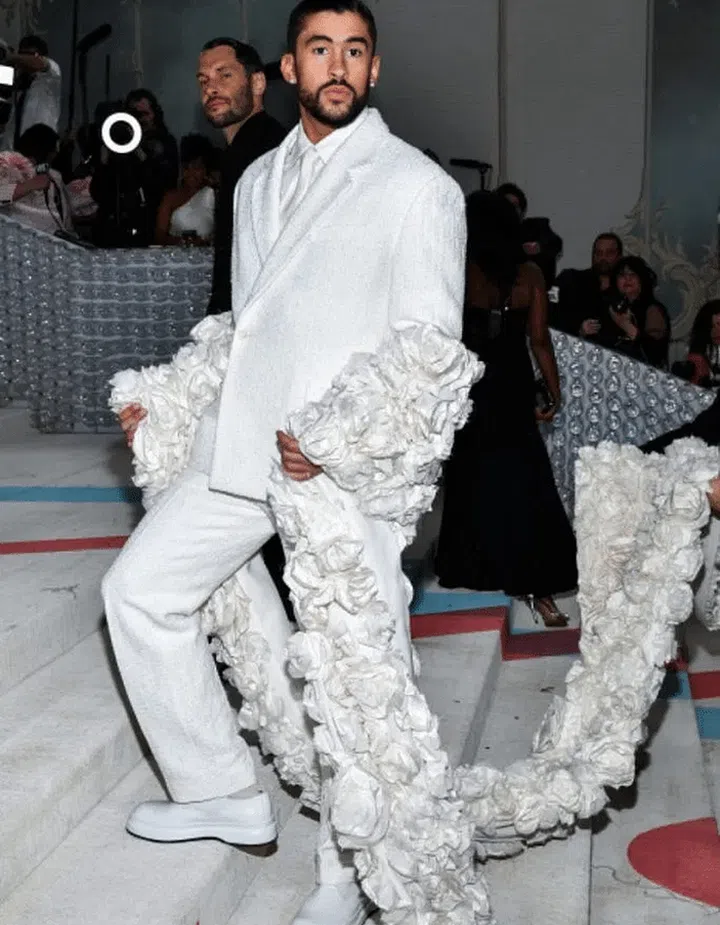 The most electrifying thing about this new movement is the fact that it doesn’t ignore the old gender binary of yore. It’s not about erasing boundaries completely — the way Alessandro Michele used to do it at Gucci — and putting boys and girls alike in the same flowy dresses. The aforementioned collections are still very much rooted in the classical codes of menswear — suits and tuxes, and the like. The womenswear touches are subtle—a cowl neck here; a pussybow there. The intention is not to make men look effeminate but to push the aesthetic limits of what’s often thought of as traditional masculinity. There is a reason why most of the models chosen by these designers fit your mental image of a typical hunk. At this point in our cultural moment, you kind of expect a Troye or a Timothée to play around with gender-coded clothing — it’s a far more powerful visual when you see Bad Bunny in a backless blazer with a flowing floral stole, or Manu Rios in a plunging silk blouse. They still very much look like symbols of manliness, but they also represent a far more tender vision of masculinity. And we could all use a little more tenderness.
