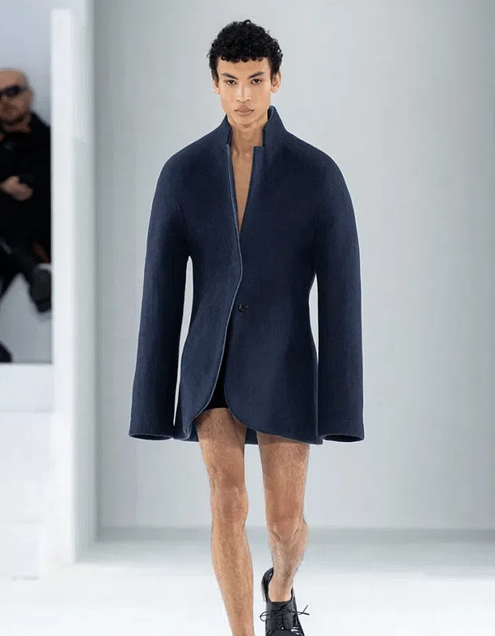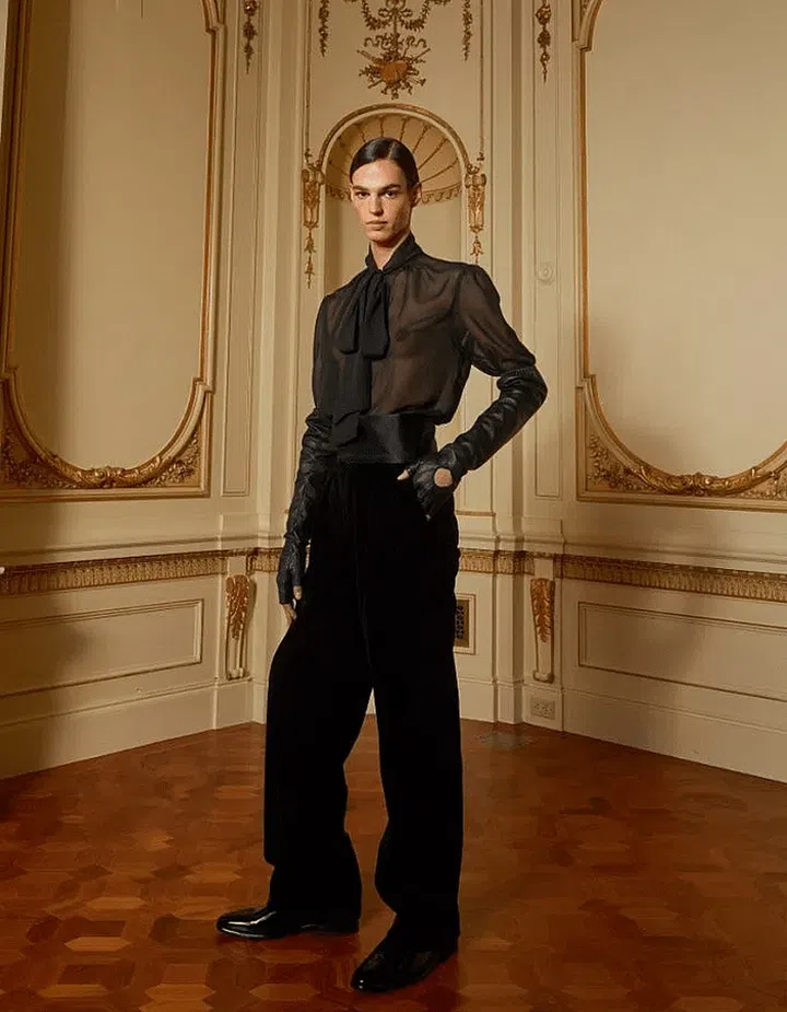 Half a century ago, Yves Saint Laurent created his iconic Le Smoking and changed womenswear forever. The menswear-inspired tuxedo was first a scandal, and then quickly a sensation. Now, his successor, Anthony Vaccarello is channelling that contrarian spirit and doing the inverse — applying the language of Saint Laurent’s womenswear into menswear. This meant silk and chiffon blouses, giant pussybows, floor-sweeping coats, and vertiginously heeled boots. For years, Saint Laurent menswear has felt like, if not an afterthought, then just a commercial continuation of the skinny rock-god aesthetic put in place by Hedi Slimane. It wasn’t until Vaccarello tapped into the inherent femininity at the heart of the brand that his menswear finally clicked.