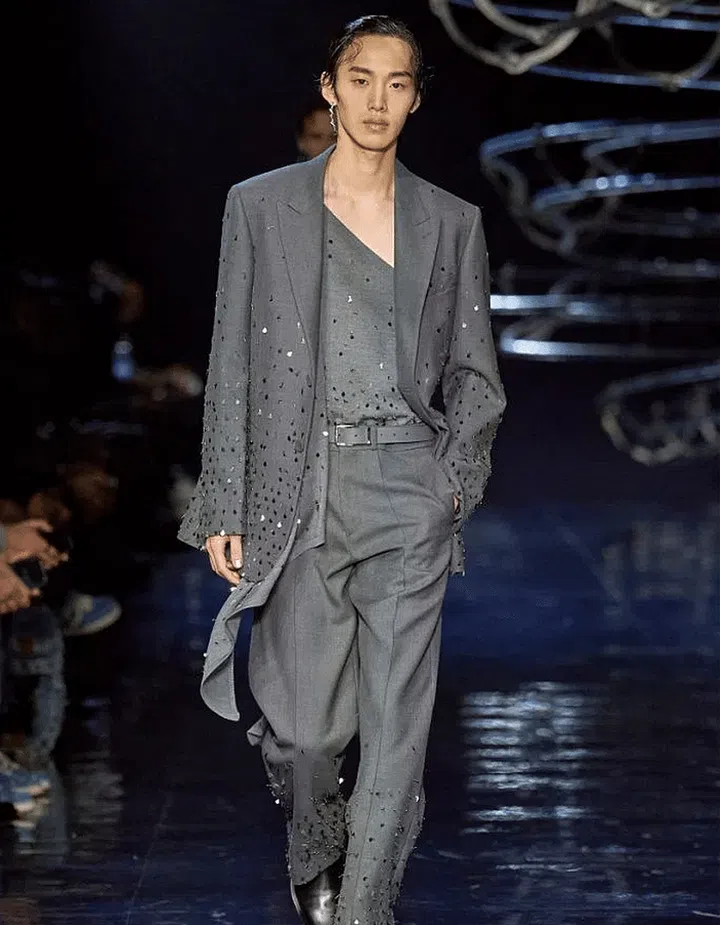 At Dior Men, Kim Jones is best known for merging streetwear with high fashion, and for translating Christian Dior’s language of French couture into menswear. For fall/winter 2023, he focused less on the street and more on the couture. His suits were soft and fluid, with gently nipped-in waists, draped lapels and the occasional flowing train. There were skirts and skirt-like shorts. Despite these feminine accents, the collection never read as anything other than menswear. At Fendi, Silvia Venturini Fendi referenced her own youth and spent dancing nights away at Studio 54. This translated into a collection filled with disco-ready one-shouldered tops, scarf dressing, and a generous dose of rhinestones and crystals. All of it made for one of Fendi’s most interesting menswear outings yet.