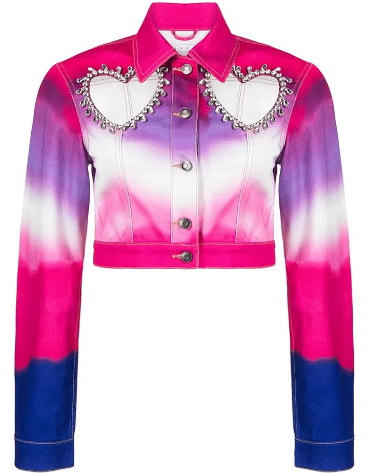 If stacking the same shades of denim isn’t for you, no fret – simply opt for an abstract print or better yet a multi-coloured ombre outerwear to contrast the shorts. Match the heels to the jacket, throw on some chunky silver jewellery and a pair of shades.