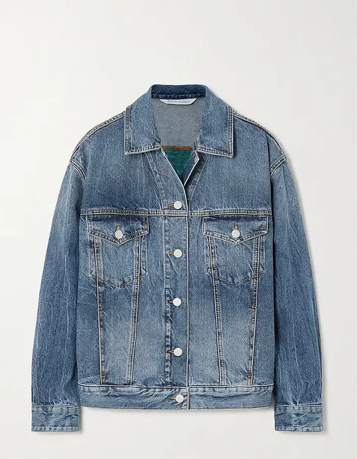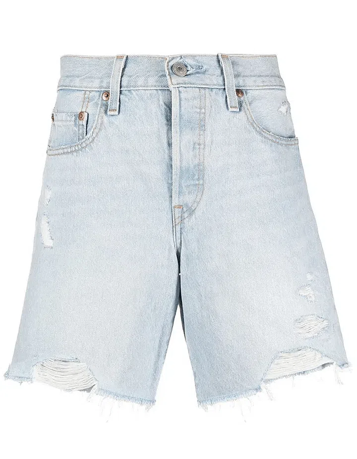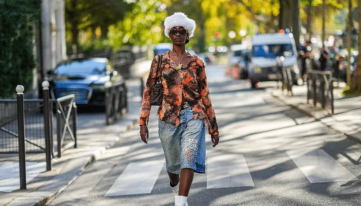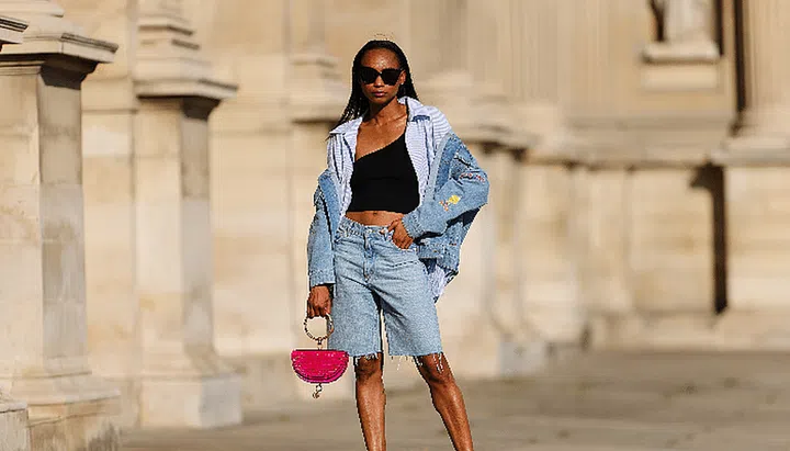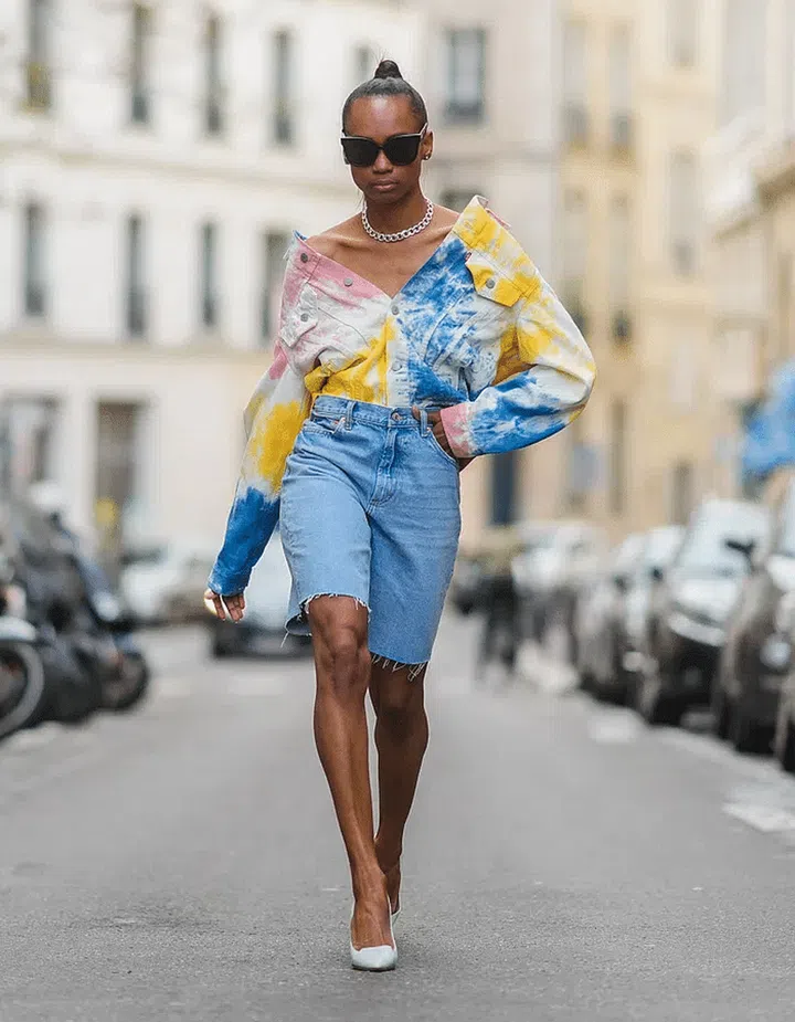 This style is far from a faux pas if executed properly, and you don’t have to break the bank to do it. Layering is key; rummage your closet for an off-the-shoulder top, a light blue shirt, denim jorts and a relaxed denim jacket in a similar shade, then complete the look with a vibrant bag and a pair of heels.