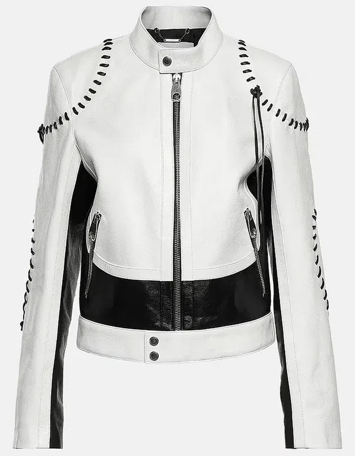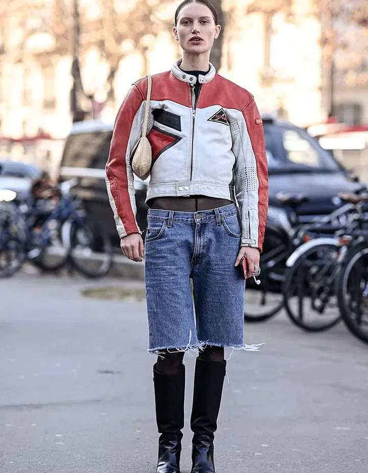 Enter the ultimate streetwear look – a leather motorcycle jacket, jorts, knee-high boots and a cute shoulder bag to carry all the essentials from a phone to your favourite lipstick.