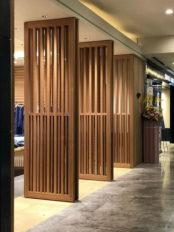 Directly opposite the entrance, behind a row of mannequins, is a standalone feature wall that may resemble ordinary wood panelling from afar. No, it’s not made of Yakusugi, but of silk instead, referencing Silk Road, where treasures were once traded.