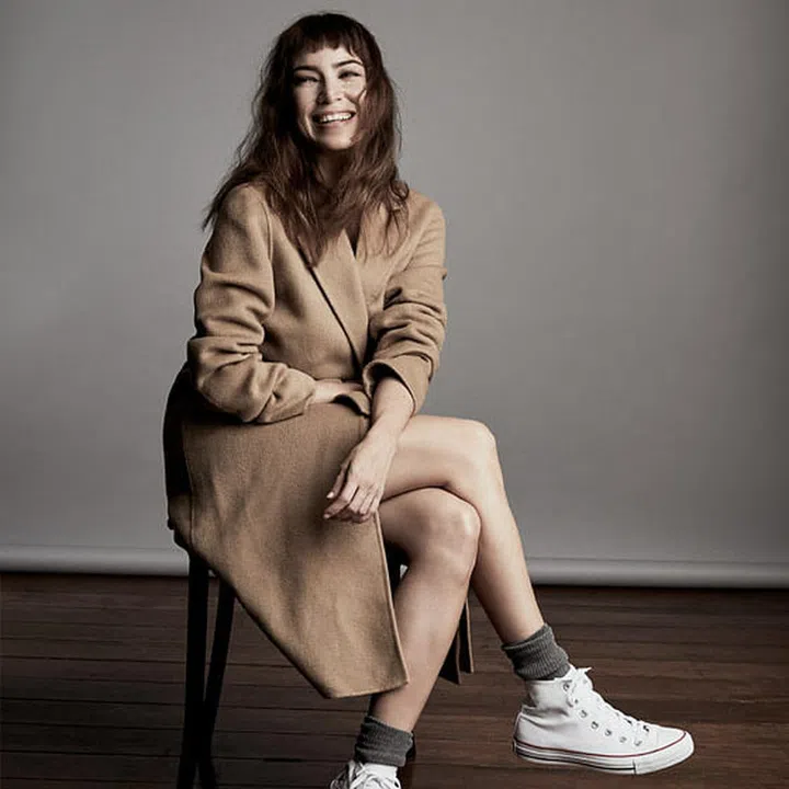 Seen here : Lined wool coat, $710, from Sandro. All Star canvas sneakers, $99.90, from Converse. Socks, stylist's own.