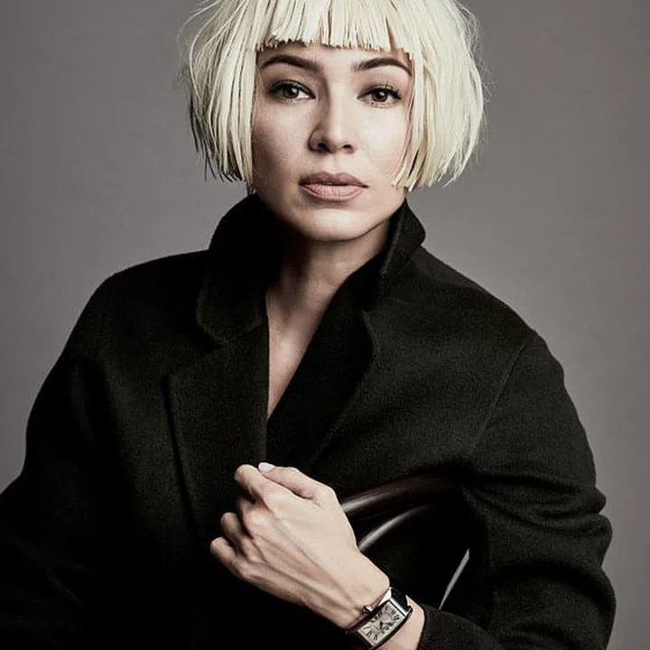 Seen here : Lined wool coat, $680, from Sandro. Cartier Tank Americaine steel watch with leather strap, $7,900. Belt, stylist's own.