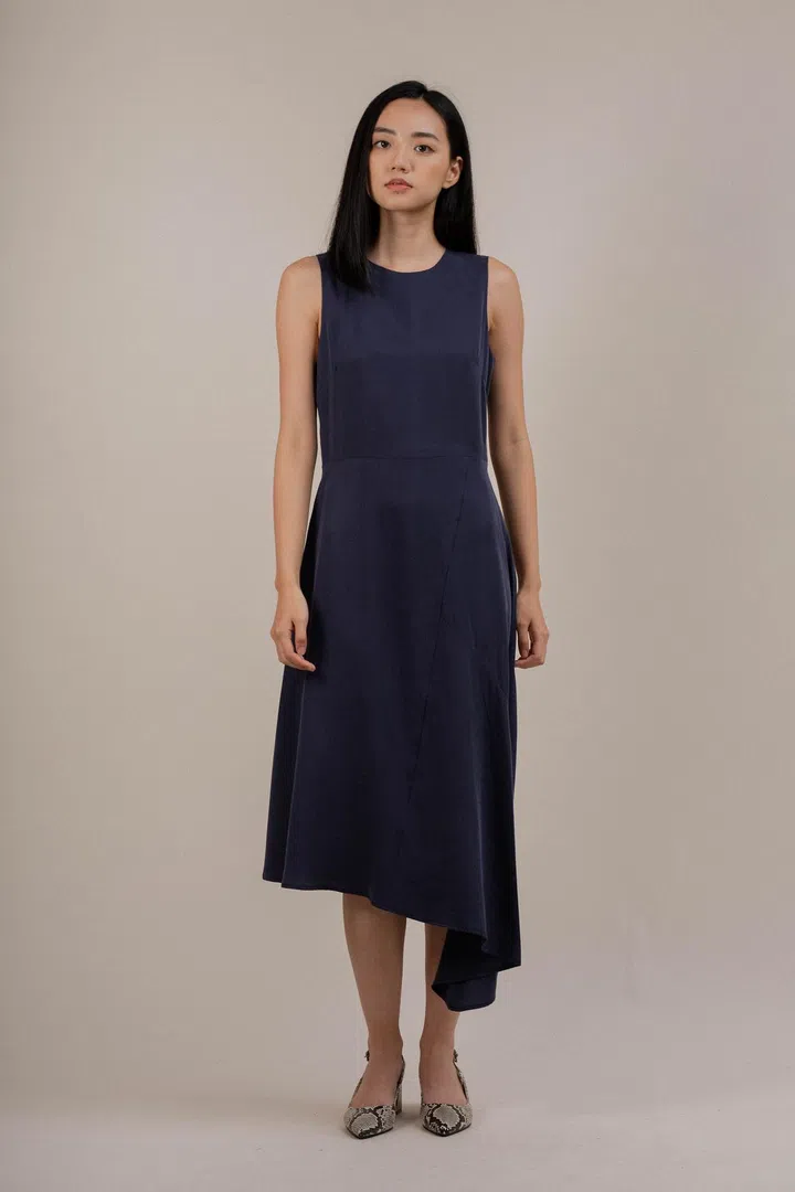 Asymmetrical hems add interest to otherwise simple pieces. This flattering navy midi dress also makes for a great canvas to style a slew of different looks, whether for work or play.