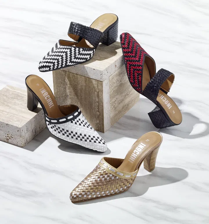 Heeled mules in Basketweave, $109.90, and heeled mules with strap in Basketweave, $119.90, Inochhi