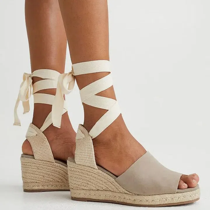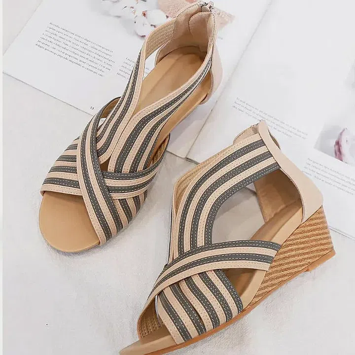 A low wedge is a great bet for those who find themselves on their feet a lot, as it offers the elevation of a heel without the discomfort. With overlapping stripes that criss-cross around the foot, this zip-up wedge sandal can be worn with skinny black pants for an everyday work look.