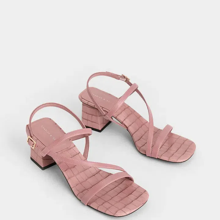 Croc-Effect Asymmetric Slingback Sandals in Pink, $56.90, Charles & Keith