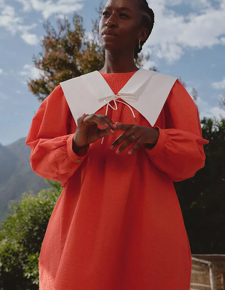 South African designer Sindiso Khumalo in the Pepper Red Smock Dress with White Collar. Credit: & Other Stories