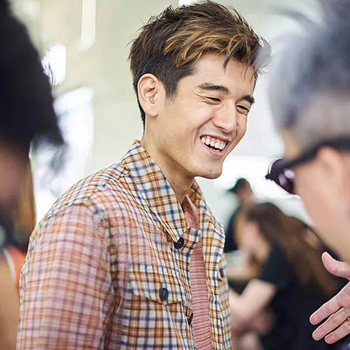 Nathan Hartono is wearing a cotton plaid jacket and a wool sweater from Fendi's SS'18 collection.