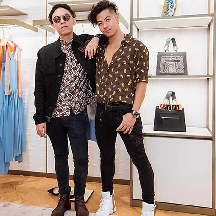 Jon Chua is wearing a printed silk shirt, jacket with Double F logo detail and sunglasses from Fendi's SS'18 collection. Benjamin Kheng is wearing a silk printed shirt from Fendi's SS'18 collection.