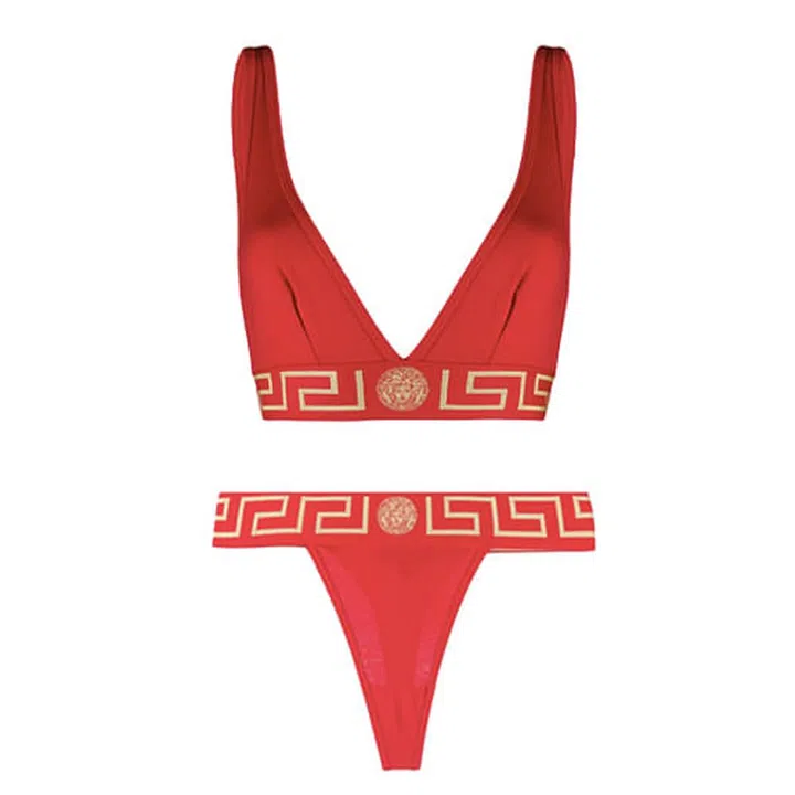 Versace Greca border triangle bralette and thong, US$160 and US$80 from Farfetch