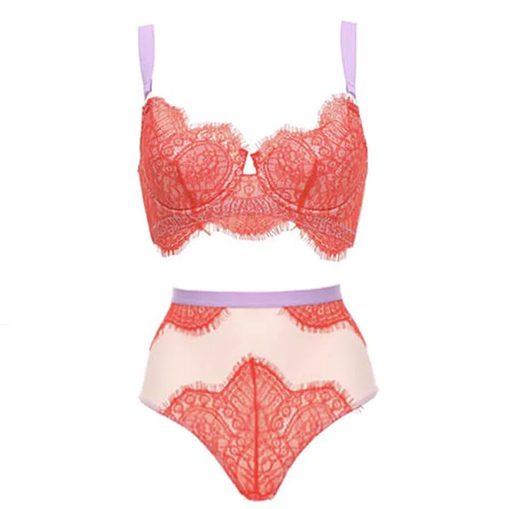 Adorning lavender straps that contrast with the sweet coral-hued superfine lace, this bra and high-waisted brief set is completely on trend with its bright, vibrant colours and soft pastels. The bra comes with underwired cups, adjustable spaghetti straps and an elastic support band. The high-waisted briefs, which as we’ve said before, is an absolute gem for combat any bloating days, has stretch mesh inserts that ensures a comfortable fit.