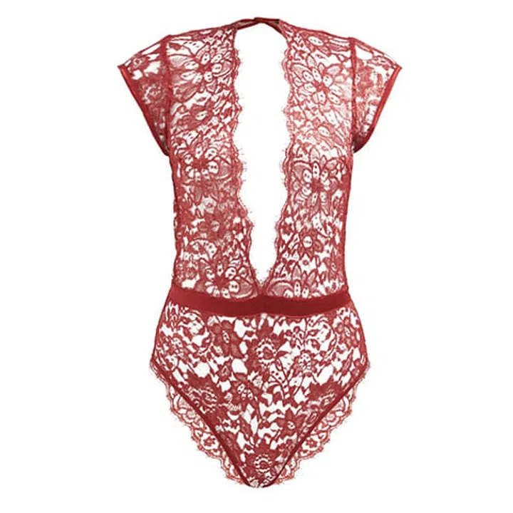 Made from incredibly fine and intricately embroidered floral patterns, this red lace bodysuit has a sexy open back and its edges are trimmed with scalloped hems. The capped sleeve design and plunging decolletage looks flattering and we think it would be fitting to wear this underneath a cheongsam or a sheath dress. It could also look interesting worn as a top, with a fitted tube top underneath and tucked into a sleek pair of trousers.
