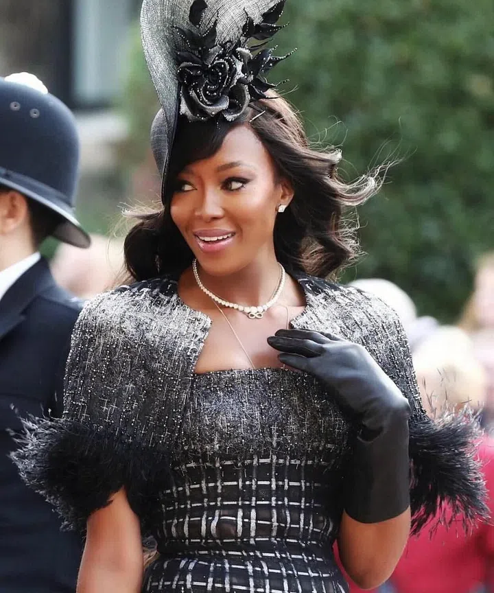Supermodel Naomi Campbell arrived in a tweed Ralph and Russo haute couture dress and Manolo Blahnik shoes and diamonds from Samer Halimeh. But the star of her outfit was a dramatic black Philip Treacy fascinator.