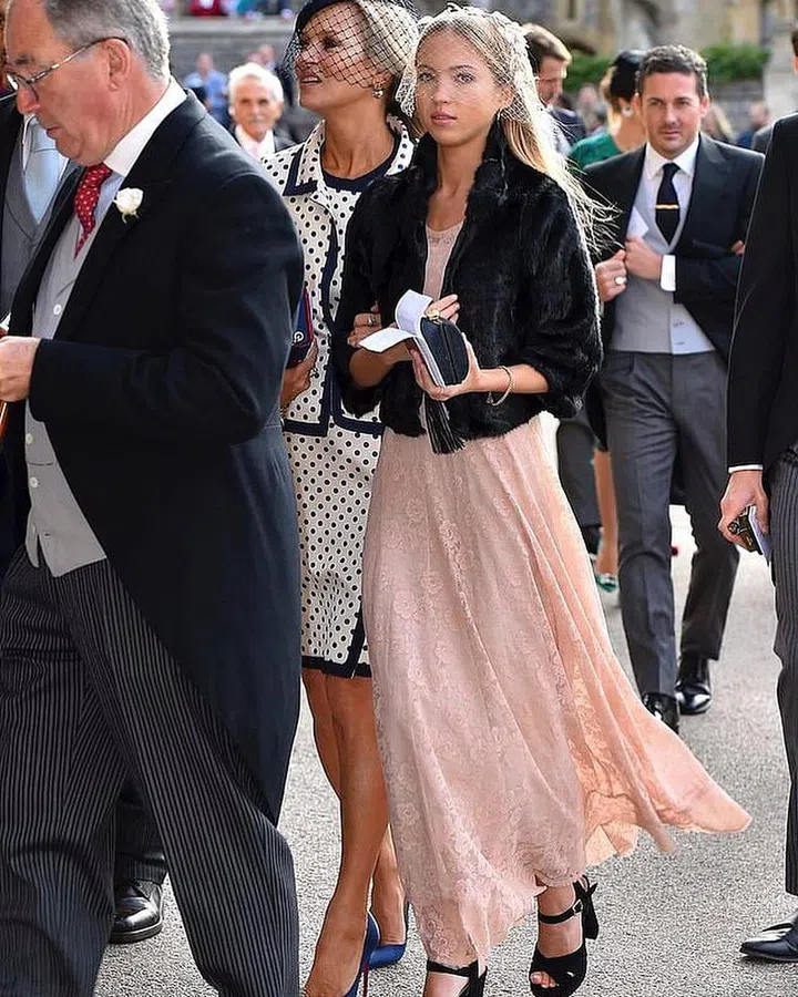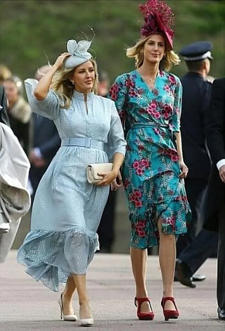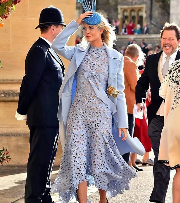 English singer/songwriter Ellie Goulding attended the wedding in a powder blue Suzannah dress with a matching hued fascinator. Keeping with the minimalist theme, she kept her ensemble simple by finishing with nude pumps and clutch.