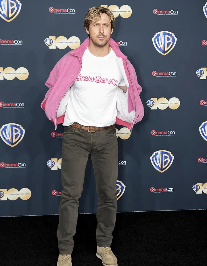 We love a Ken who supports his film director, but we also enjoy the juxtaposition of a good ‘ol pink canvas jacket with deep green khakis and brown low-top sneakers. Who said men can’t wear pink? Gosling sets the perfect example on how to use the colour in your daily wardrobe.