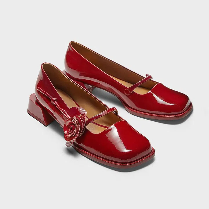 Chloris Patent Leather Rose-Embellished Mary Jane Pumps, $269.90, Charles & Keith