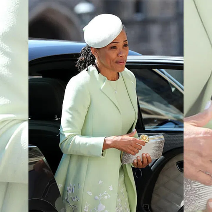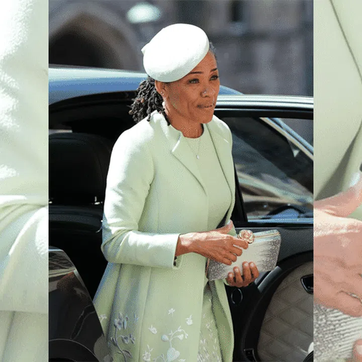 Meghan’s mother Doria Ragland, who was the only member of Markle’s immediate family that was in attendance for the big day, wore a sophisticated mint green dress embroidered with white florals by Oscar de la Renta and a matching cocktail hat. Featuring a knee-length overcoat worn over a shift dress, the classic silhouette was the perfect choice for the mother-of-the-bride.