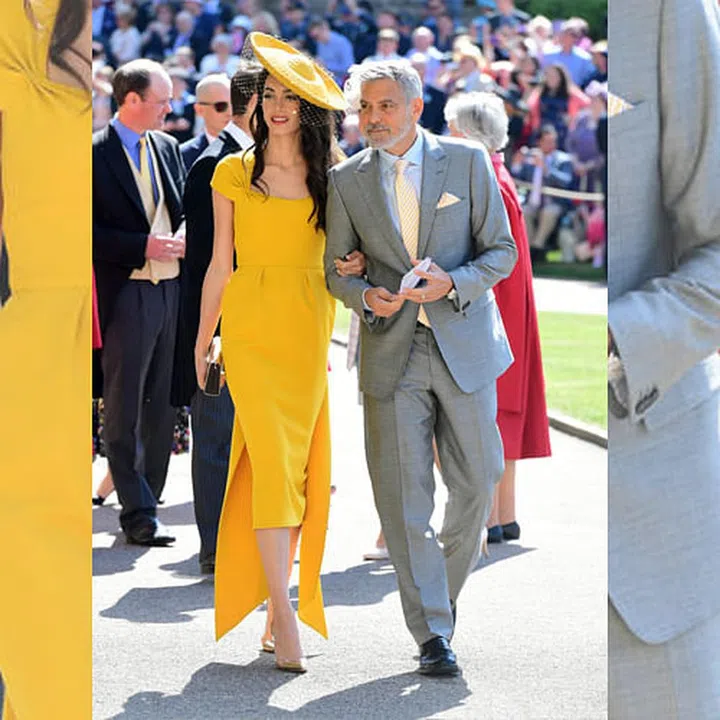 Amal Clooney stood out from the crowd in a honey yellow Stella McCartney ensemble, her figure-hugging cap-sleeved dress paired with a matching net-covered hat by Stephen Jones. She accessorized with teardrop earrings, a gold clutch and gold closed-toe heels, considering how open-toe shoes are a no-no at royal weddings.