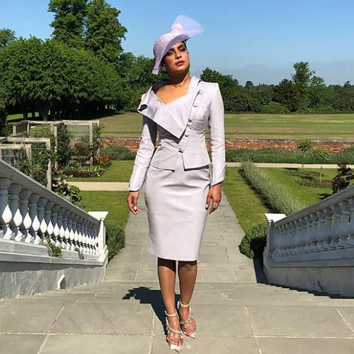 One of Meghan Markle’s closest friends Priyanka Chopra wore a bespoke lilac Vivienne Westwood tailored dress and a Philip Treacy hat. The gorgeous actress looked incredibly lady-like and polished in the monochromatic fitted suit which featured a unique asymmetrical fold along the neckline.