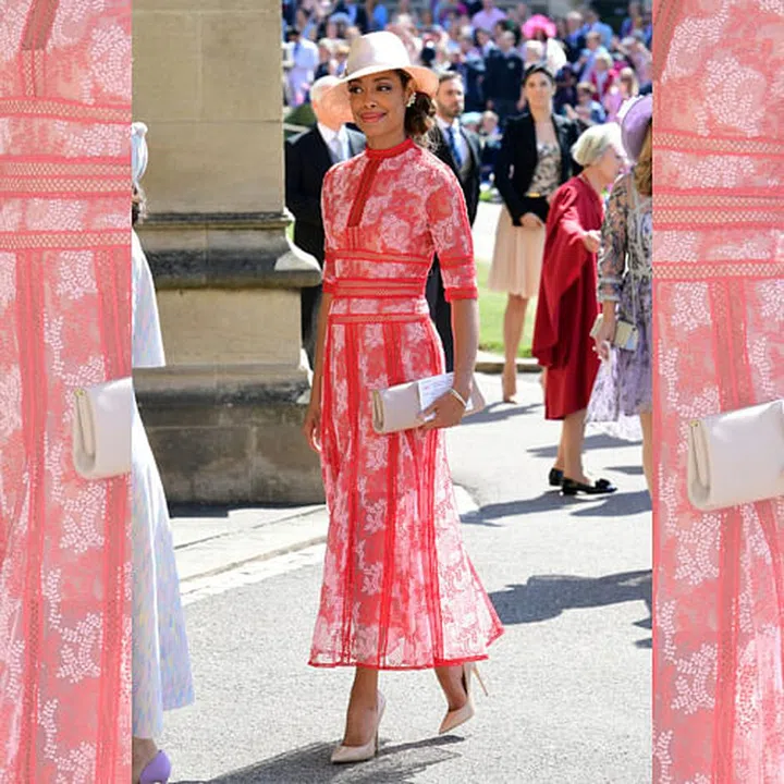 Meghan’s Suits co-star Gina Torres played to the summery weather with a stunning high-necked pink and red Costarellos dress, which she teamed with a cream-coloured hat and clutch. The show-stopping brightly-hued dress from the Greek fashion house featured floral lace details and a sheer plunging panel, rendering it a glamorous ornate choice for the big event.