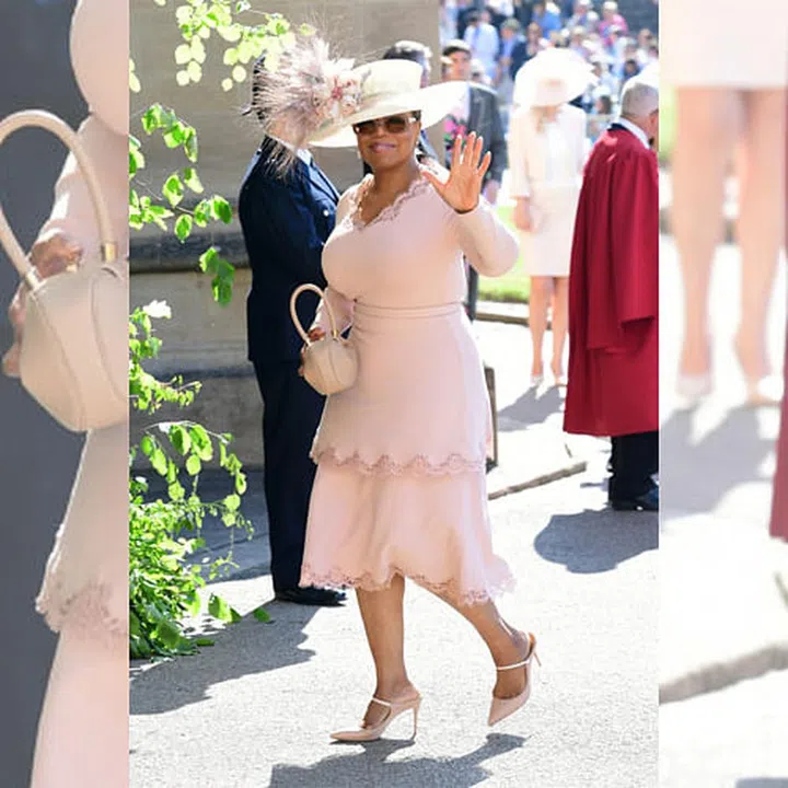 It seems like pink is the hot colour of choice amongst wedding guests at the royal wedding this year. Oprah Winfrey wore a bespoke Stella McCartney blush-pink midi-length tiered dress with lace trim. The dress is made of sustainable viscose knit and accessorised with a cream hat with a matching pink floral embellishment.
