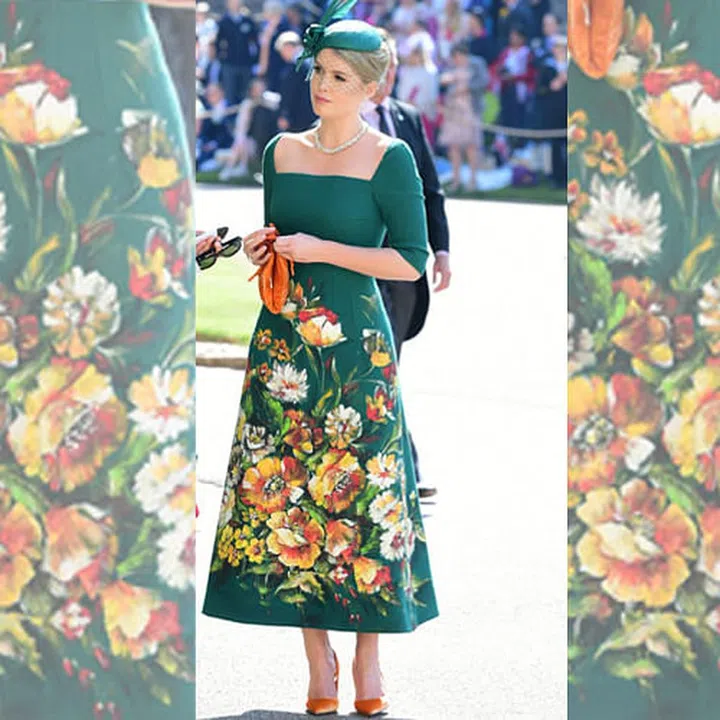 The eldest daughter of the late Princess Diana’s brother Earl Charles Spencer, model Lady Kitty Spencer wore an incredible Dolce & Gabbana printed floral dress in green. She teamed it with a contrasting burnt-orange clutch and matching court shoes.