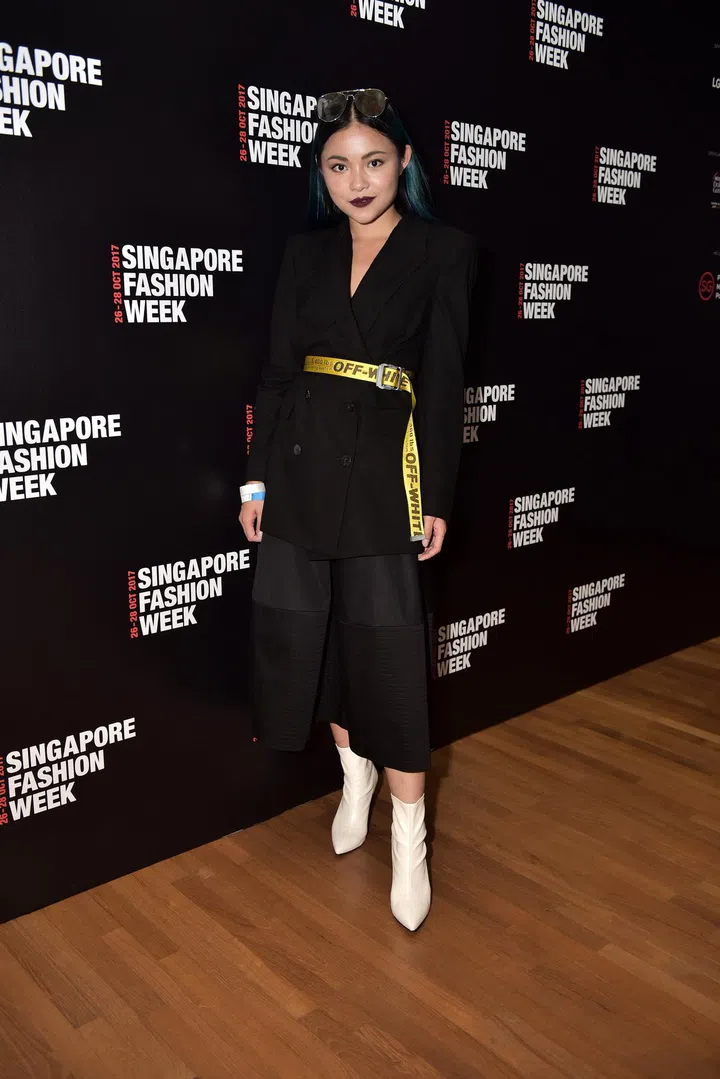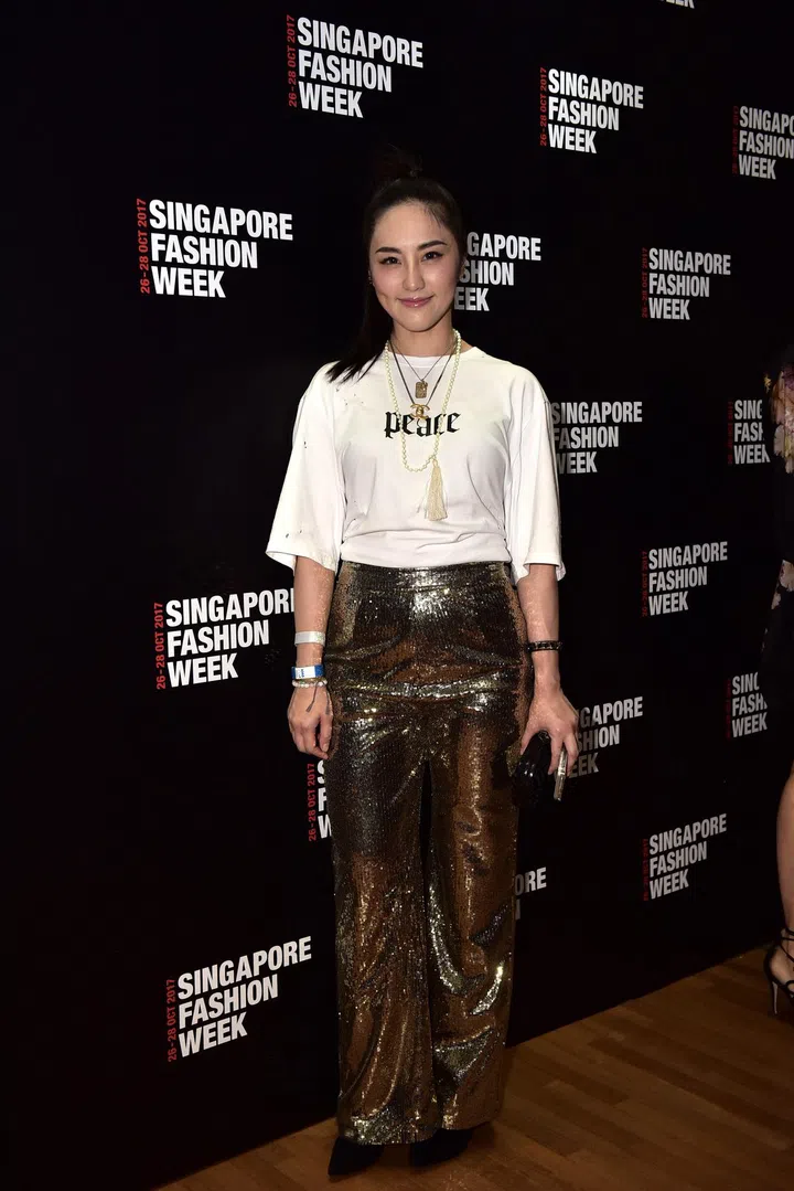 Fann Wong (@fannaiaiwong) demonstrates how you can go all-black and still look as stunning as ever. Her leather turtleneck, high-waisted pants and diamanté platform heels bring glam-rock to the SGFW event. With a neat high-bun paired with long choppy bangs and topped with bold red lips and her signature luminous complexion, she brings classic simplicity to a whole new level.