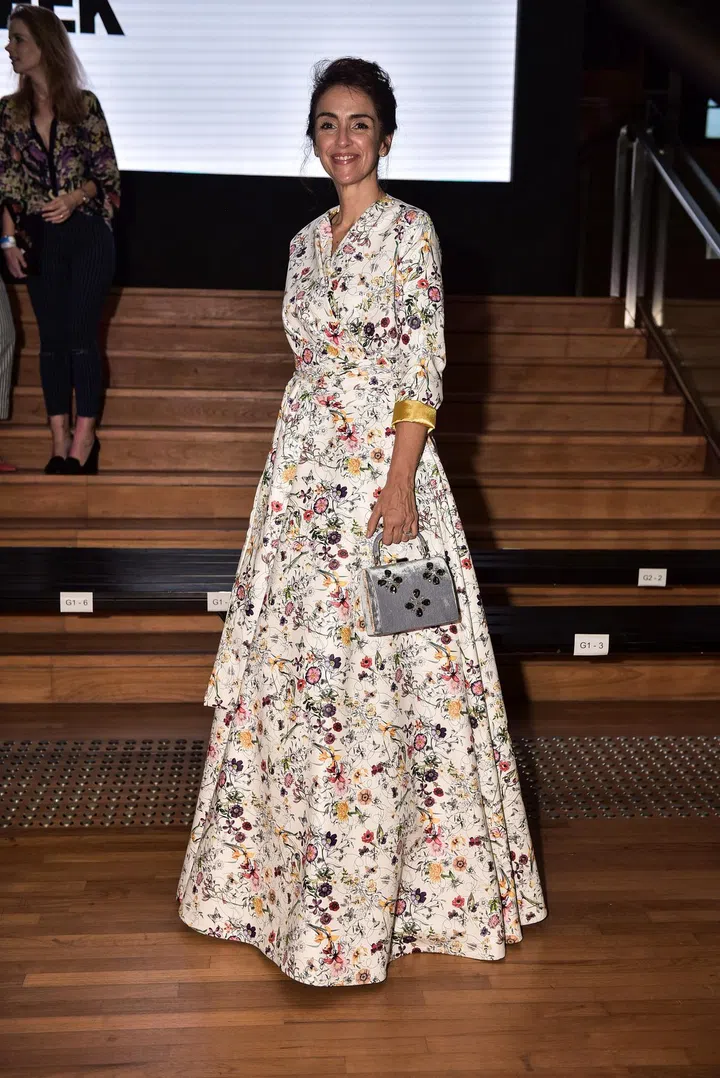There’s a fine line between a hit and a miss for florals, and here this floor-length dress is an absolute win. Set against a white background, the burst of flowers are balanced nicely with a jewel-embellished purse and an aú naturél makeup look.