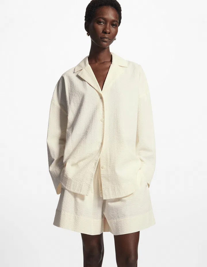 We love a good oversized shirt, and the use of a textured seersucker fabric helps keep this look from tipping over into looking sloppy. Plus, it promises a comfortable wearing experience, whether you're lounging in your couch or running errands around town.