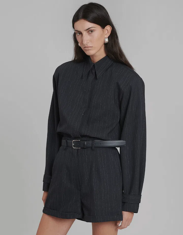 Padded Shirt in Black Stripe, US$165 (SG$234), and Cuffed Shorts, US$109 (SG$155), The Frankie Shop