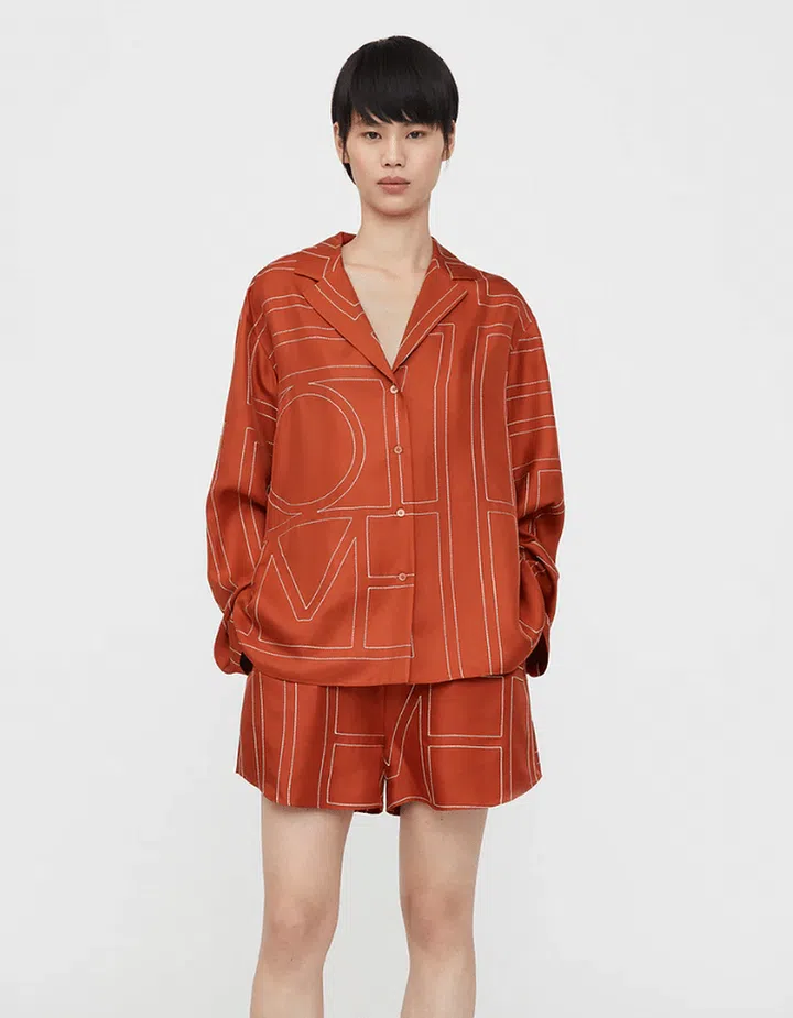 Known for their quietly minimalist designs, Toteme's take on the trend sees luxurious reams of silk dyed in a rich terracotta colour and printed with a graphic monogram print. It's so chic, that you could easily pair it with sneakers and you're all set for a Saturday out and about.