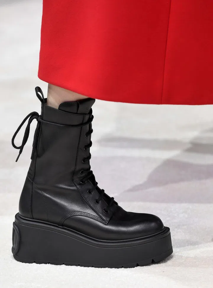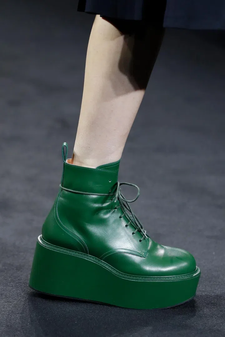 Having shown tonnes of lovin’ to chunky platform soles for the past couple of seasons, designers are now looking into flatforms: a.k.a, a platform with a flat sole. Rochas’ lace-up combat boots were rendered wholly in saturated crayola green.