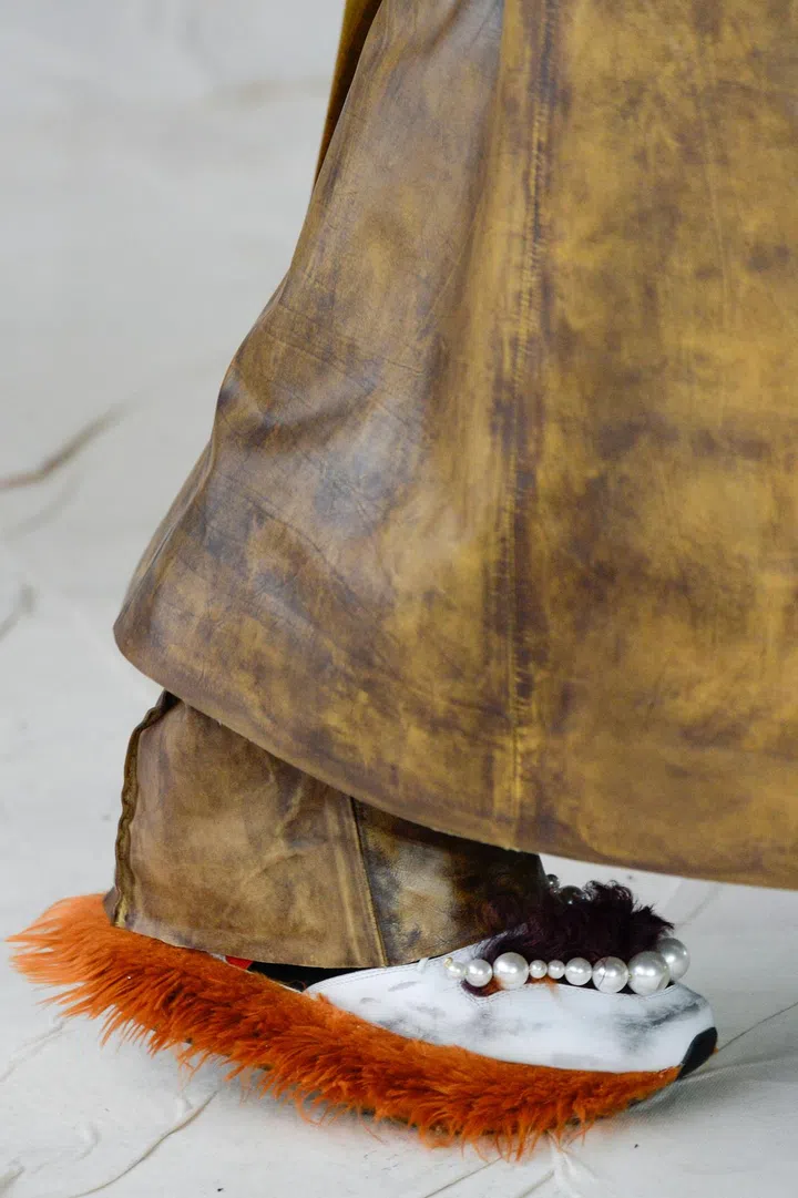 Marni lived true to its quirky whimsical style with sneakers trimmed with big faux pearls and russet orange fur trimming along the sides.