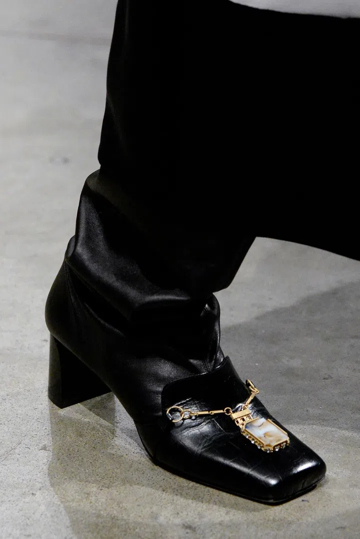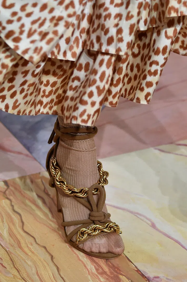 Shoes embellished with chain accents appeared to be quite prominent across the FW 20 runway shows. Come to think of it, jewellery for the feet has been a huge trend as of late – what with the return of anklets, and big dazzling embellishments and charms hanging off of shoes from Simone Rocha and Loewe. Ulla Johnson bedecked glossy boots and sandals with puffy knotted straps with chunky gilded chains.