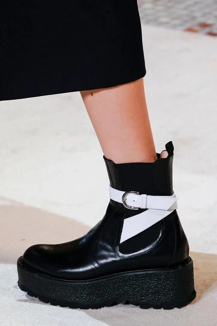 Giambattista Valli reconfigured the Chelsea boot with contrasting white buckled straps and a pebbled texture sole.