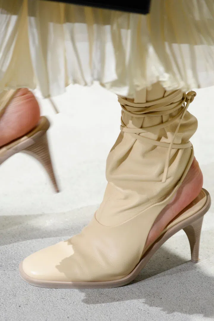 During the last few seasons, designers such as JW Anderson have made shoving baggy trouser pants into ankle straps a thing. This fall, we’re seeing a new and evolved rendition of the styling trick in the form of cinched boots. At Jil Sander, a soft buttery leather boot with an opened heel had suede ribbon ties snaking around and scrunching up the fabric around the ankles, giving rise to an effortlessly modern and minimalist number we’d imagine would pair well with voluminous white cotton poplin dresses for the office.