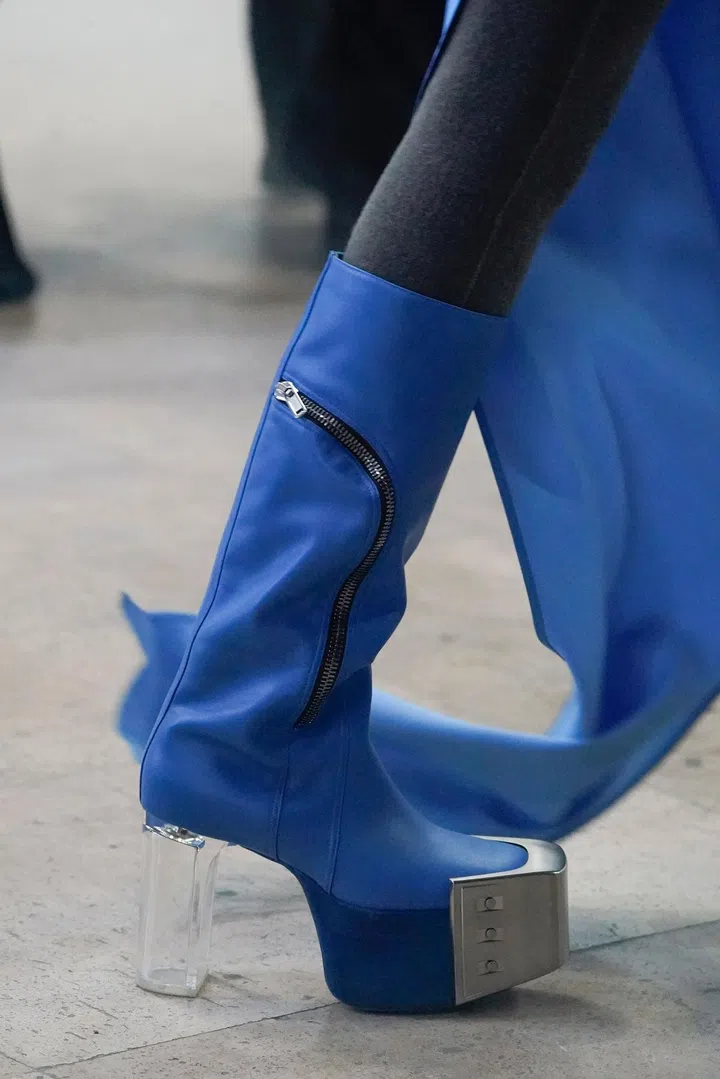 Rick Owens amped up the drama with chunky platform boots fitted with clear block heels and fitted with intimidatingly-sized iron-like toe caps.