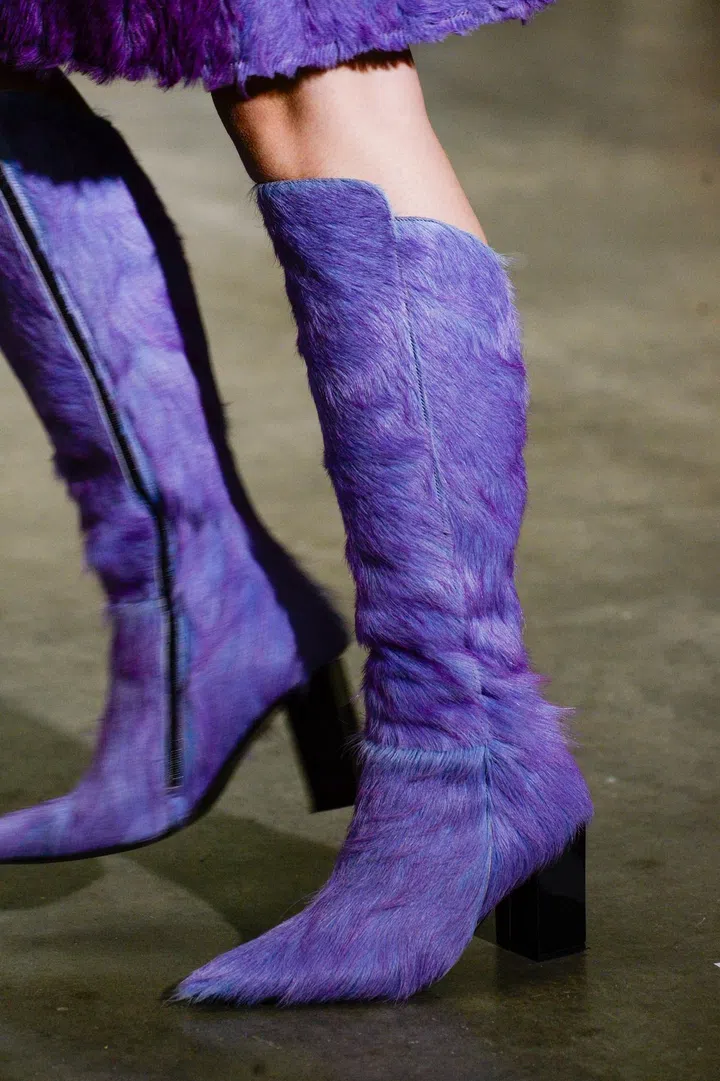 Fashion’s obsession with staying comfy does not seem to be waning anytime soon. Just as we thought there was no way we could push the soft and cushy tactile agenda beyond padded bags and shearling coats, fluffy textured shoes are apparently going to be a thing for fall. Marques Almeida covered pointed toe knee-high boots in bright purple and blue ombre fur.