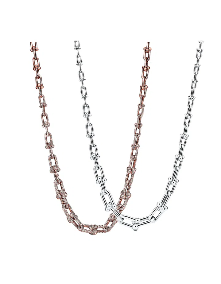 Drippin’ in ice: Hardwear rose gold and diamond necklace, and Hardwear white gold necklace, Tiffany & Co.