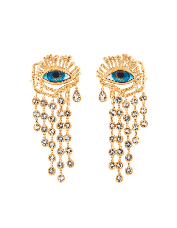 Fabulous And Fit: Gaze pendant gilded brass earrings with, rhinestones, $1,765, Schiaparelli at Schiaparelli.com